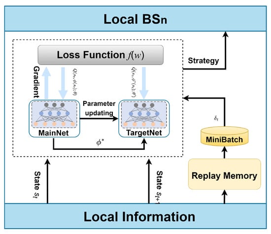 Figure 2 illustrates the training process of DDQN, where every individual local BS maintains a finite-size experience replay pool, which is refreshed with the latest transitions. The Q network (MainNet) of the deep reinforcement learning (DRL) framework is leveraged to determine system actions, while the network (TargetNet) is utilized to evaluate the selected actions. The in the network is periodically updated with in the Q network. During the training process, the agent randomly selects a minibatch from the experience replay pool and trains the Q network by minimizing the loss function for each iteration,