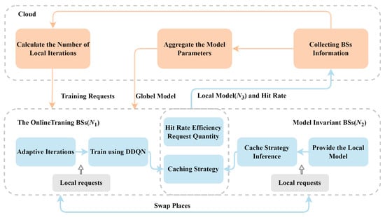 It should be noted that the edge BSs are divided into two categories: BSs for online training and BSs with fixed models. The BSs involved in online training need to receive global model parameters from the cloud and update their cache strategies in real time through DRL. The cache strategy for fixed-model BSs remains unchanged. The energy consumption of sending models from BSs is explained in Section 3.3. Both BSs for online training and BSs with fixed models need to calculate their cache hit efficiency after each round of local training. The online training BSs and model invariant BSs at the edge can be dynamically switched based on changes in the cache hit efficiency and content request number.