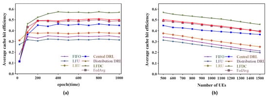 Average cache hit efficiency for different algorithms with (a) epoch (time) increasing, (b) number of UEs increasing.