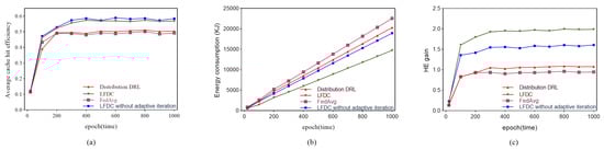 Comparison of HE gain obtained by using distribution DRL, LFDC and FedAvg with the epochs (time) increasing.