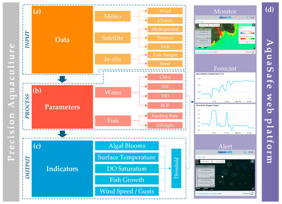 - The estimated parameters, which include water temperature, dissolved oxygen, chlorophyll-a, biogenic oil film, and fish growth metrics, are derived from the processing of the input data and are then combined to determine the indicators or “warning signs” (Figure 1b).