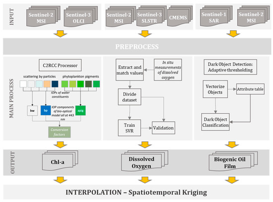 The input satellite and CMEMS data were preprocessed and used to estimate the relevant water quality parameters.