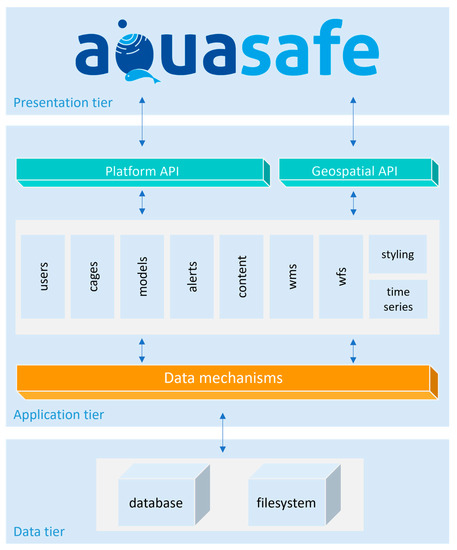 The “Aquasafe” web platform is a custom content and data management platform developed in the framework of a national project. The implementation of the application has been based on modern and open-source software technologies. The platform is based on a 3-tier architecture (Figure 3). The data tier is supported by a spatially enabled Relational Database Management System (RDBMS). The application (business logic) tier has been implemented by utilizing Application Programming Interfaces (APIs) and by deploying data harvesting, data curation, and product deriving mechanisms. The APIs concern both the content-related elements and operations of the platform, as well as geospatial information services’ provisioning. The geospatial services are based on interoperable and de juro/facto ISO/OGC standards, i.e., Web Mapping Service (WMS) and Web Feature Service (WFS). The web interface (presentation tier) harnesses the APIs’ capabilities to provide the derived functionality.