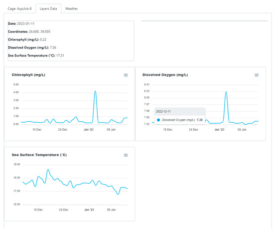 However, it is important to note that this is an ongoing process. Continuous efforts of evaluating and testing the platform to incorporate any improvements are expected to make it even more user-friendly and effective for the aquaculture industry. The integration of data derived from UAVs, which have already been widely used in land and sea applications [59,60,61,62], can provide a wealth of data for managing fish farms. By utilizing cameras, sensors, and other instruments, drones can capture high-resolution images and data on various important parameters for fish farm management such as water quality, fish health and behavior, farm infrastructure, and environmental conditions [63,64,65,66]. Finally, incorporating sea surface current data from remote sensing and numerical models can provide valuable information on the direction, speed, and variability of the currents. The current information can help identify areas of high or low current flow, and when combined with other aquaculture-related parameters such as water temperature, dissolved oxygen, and chlorophyll-a, it can improve the accuracy of forecasts and alerts. Additionally, it can help farmers to take appropriate actions, identify the potential risks and benefits of different farm locations, and predict the effects of different management strategies.