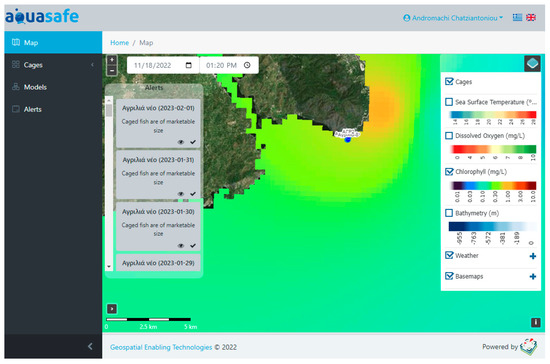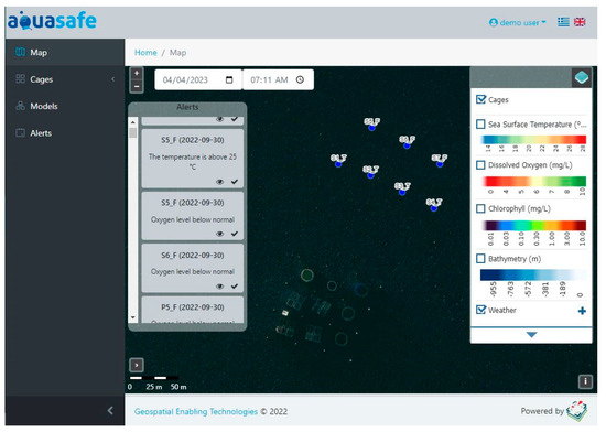 Figure 5. Aquasafe web-based platform landing page, showing relevant information about fish cages, model results, and alerts on the left panel and environmental and meteorological parameters on the right side of the map. On the map, the added cages appear as blue points labeled based on the user’s preference. In this example, the points have not been positioned on the cages for visualization purposes.