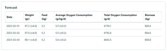 - Fish growth and target weight: The appropriate marketable weight of farmed fish varies depending on the species and consumer preferences. For example, in the case of gilthead seabream and European seabass, the typical marketable weight is generally considered to be portion sized (300–400 g), but demand for larger sizes (600–800 g) also exists [49,50,51]. However, this can vary depending on the specific farming conditions and the market demand. For gilthead seabream, it is expected to reach the marketable weight within 12–18 months of farming, while European seabass takes slightly longer, typically reaching the marketable weight within 18–24 months [33]. On the other hand, meagre, an emerging species in Mediterranean aquaculture with high commercial potential, grows faster and reaches market size of 700 g within a year, while its weight may exceed 2 kg in only two years at sea [52]. It is important to note that reaching the marketable weight is not the only consideration when determining the harvesting of the fish. Other factors that should be taken into account include the fish’s health, growth rate, and the overall condition of the farm [49]. Additionally, the market demand for a certain size of fish also affects the appropriate marketable weight. Overall, appropriate marketable weight of farmed fish is a crucial aspect of the fish farming industry. It ensures that the fish are of good quality and are ready for market and also affects the profitability of the farm. The relevant alert is triggered based on a user-defined threshold and the predicted change in weight (ΔWeight) as forecasted by the growth model.