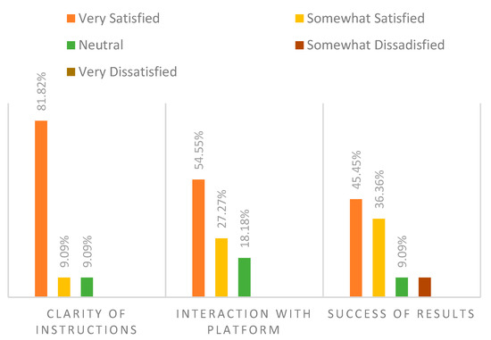The Aquasafe user interface was evaluated by relevant experts in the field, including scientists and stakeholders, through a user satisfaction survey. Participants were given specific scenarios and step-by-step instructions and were asked to provide feedback on the amount of time it took to complete each task, the clarity of the instructions, their overall satisfaction with the system, and any suggestions for improvement. The survey results showed that 27.3% of users were able to complete all tasks in under ten minutes, 54.5% took between 10 and 20 min, and 18.2% took longer than 20 min (Figure 8). The majority of users found the instructions clear and easy to follow (82%), and over half of the participants reported being quite (28%) or completely (55%) satisfied with their interaction with the platform and the results they achieved (82%) (Figure 9). However, some users did express difficulty with navigation and searching for specific information, as well as exporting results. Despite these minor criticisms, the overall feedback from users was positive, with suggestions for further improvements to the platform.