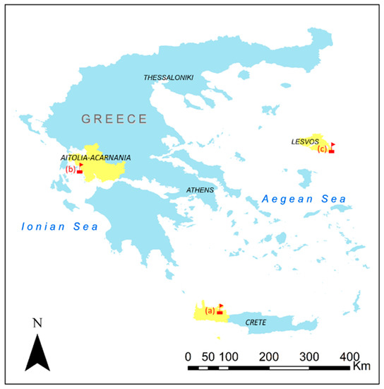The map shows the three areas that were used as case studies to validate the performance of Aquasafe web-based platform: (a) HCMR pilot aquaculture farm (Souda), (b) PLAGTON S.A. commercial fish farm (Astakos), and (c) AVRAMAR S.A. commercial fish farm (Agrilia).