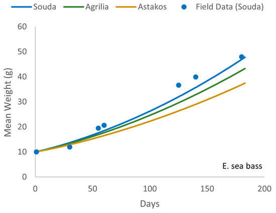The following figures show selected outputs from the three study areas. Reference cages of 300 m3 volume were created for the three study areas and were stocked with either of the three fish species at varying sizes. Next, the entire 1 April 2022–1 October 2022 growing season was simulated taking into account the respective environmental parameters. As seen in Figure 11 and Figure 12, the tool performed well, not only realistically depicting the seasonal growth patterns of the considered species but also capturing quantitative differences across the study areas. Specifically, growth predictions of both European sea bass and meagre from the Souda pilot farm closely matched the corresponding field measurements regarding fish weight, thus corroborating the validity of the models. Moreover, some notable differences were observed among the aquaculture sites. The weight increase was the fastest at the Souda site and the slowest in Agrilia, with Astakos exhibiting intermediate values. While data for validating such differences are not provided, their interpretation is intuitively found in latitudinal differences among them. Namely, the area exhibiting the highest growth rates (Souda) is also the southernmost, thus corresponding to higher temperatures which are beneficial for growth.