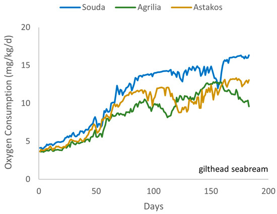 Another output related to fish that the platform generates is fish respiration, which is a useful metric for evaluating the oxygen requirements at the farm level. Taking the example of gilthead seabream, we show that the model captures the typical seasonal patterns in oxygen consumption across the three aquaculture sites (Figure 13). In particular, respiration is predominantly affected by temperature and body size, and this is reflected by the steady increase in the oxygen consumption rate as the simulation progresses through spring (days 0–60), eventually reaching the highest values during the summer months (days 60–150). Quantitative differences exist here as well, with the southernmost and warmest area (Souda) exhibiting higher oxygen consumption values compared to the other two—a pattern similar to that of growth rates.