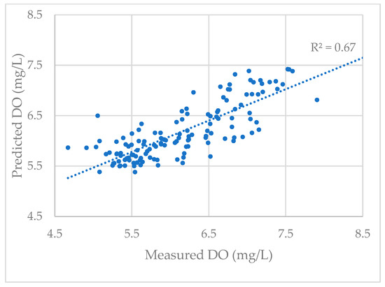 R2 value was calculated as 0.67 (Table 2), indicating its suitability for real-world applications. Furthermore, the time-series plot indicated distinct seasonality in temperature and dissolved oxygen levels (Figure 16). Specifically, temperatures were higher during summer months (June to September), while dissolved oxygen levels were lower in the same period. The correlation between temperature and dissolved oxygen levels was negative, with elevated temperature values coinciding with reduced dissolved oxygen levels and vice versa (Figure 17). Notably, a comparison of predicted and measured values demonstrated a close match, with the model accurately capturing the underlying patterns and trends in both parameters.