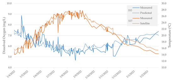 Time-series plot of sea surface temperature and dissolved oxygen predictions and measured values showing distinct seasonality.