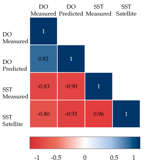 The correlation between the measured and predicted values of dissolved oxygen (DO), along with the measured and satellite values of sea surface temperature (SST), is illustrated in the heatmap.
