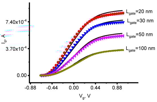 The advanced TCAD tool Sentaurus is used to numerically simulate the device. Since 2D MoS2 is not included in the standard version of Sentaurus, the parameters and simulation methods proposed in [2,13] are implemented. The main idea of the method for simulating 2D material-based MOSFETs proposed in [2,13] consists of the following steps: (1) the compilation of data for the material and transport parameters needed for the simulation of 2D material-based MOSFET; (2) the elaboration of a suitable approach to correctly describe the density of states (DOS) and the quantum capacitance in 2D material-based MOS structures; and (3) the implementation of these features in TCAD. It has been shown that carrier transport in 2D MoS2 MOSFETs with channels of dimensions 10 nm and even sub 10 nm are still far from ballistic but dissipative and scattering dominated channels [14,15,16]. The drift–diffusion approach is also considered a reasonable guide in the presence of transient and quasi-ballistic transport in short-channel MOSFETs as it correctly accounts for both device geometry and electrostatics [17]. In order to account for thermal effects, the thermodynamic transport model is used in conjunction with the drift–diffusion transport model in our simulation. To calibrate the model used, simulation results of the Id-Vg characteristics are compared with the results in [2]. The comparison for different gate lengths of the transistor (see Figure 1) has led to a good agreement.
