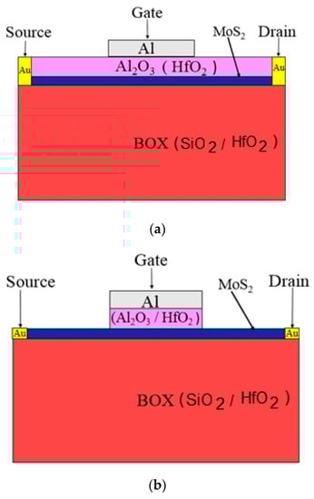 In order to define the optimal structure of the transistor to increase the immunity against degradation effects, the SHE and DIBL effects for a MOSFET with 2D MoS2 as transistor channel are simulated in two cases (see Figure 2). In the first case, the length of the gate oxide is equal to the length of the MoS2 channel (Figure 2a), and in the second case, the length of the gate oxide is equal to the length of the gate (Figure 2b).