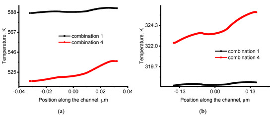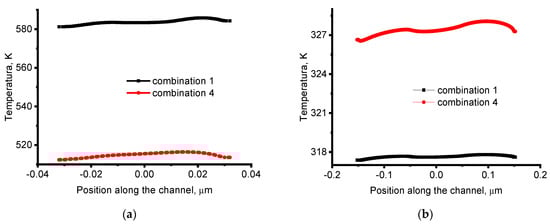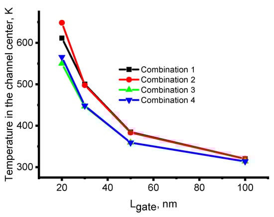 With a gate length less than 40 nm, for combinations 1 and 4, the lattice temperature in the middle of the channel is slightly higher for transistors where the channel is covered with gate oxide only under the gate (second case) than for the transistors of the first case. This is related to the quite different thermal conductivity of gate oxide materials and air. In the first case, the transistor channel is fully covered with oxide (Figure 2a), while in the second case it is partially covered with air (Figure 2b). In the wide temperature range (between 90 K and 1473 K), the thermal conductivity of air has values between 0.0084 and 0.0915 W/(m K). These values of the thermal conductivity of air (even appropriate for 1473 K) are 2–3 orders of magnitude lower than the thermal conductivity of aluminum- and hafnium-oxides. Thermal conductivities of Al2O3 and HfO2, depending on the size and temperature, are in the ranges of 6–30 W/(m∙K) [21,22,23,24] and 0.27–4.3 W/(m∙K) [25,26], respectively.