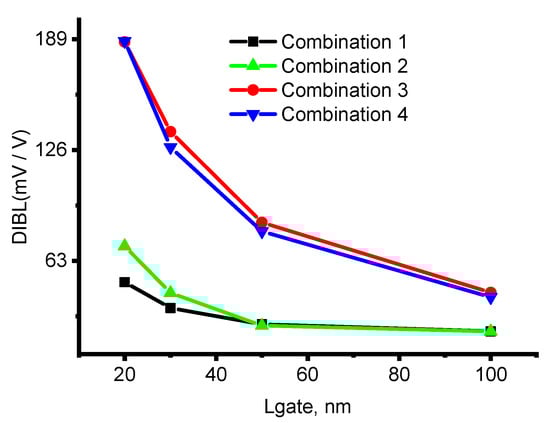 The capacitance components CG, CD.ch, and CD.ox depend on the dielectric constant of the channel εMoS2, while CD.box is unaffected by and depends on the dielectric constant of the BOX material. In our case, , and and . Therefore, since the dielectric constant of the channel is smaller, the gate capacitance CG and the components CD.ch and CD.ox are reduced, and the DIBL effect is mainly defined by CD.box. Thus, for the considered transistors, the DIBL effect is defined by the dielectric constant of the BOX. In the range of combinations, the BOXs with the highest dielectric constant are in combinations 3 and 4, where oxide materials are HfO2 with , hence these combinations should show the highest DIBL effects. Therefore, while the BOX material for the transistors with combinations 1 and 2 is SiO2 with a lower dielectric constant (), the DIBL effect for these transistors should be low. These suggestions are in perfect agreement with Figure 7. It can also be seen in Figure 7 that the gate oxide material does not have a considerable impact (or influence) on the DIBL effect in the considered range of variation of the gate length.