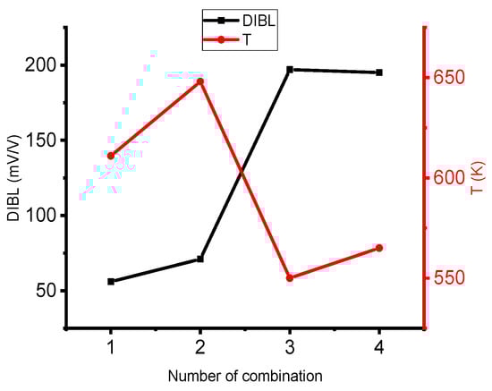 The dependence of lattice temperature and DIBL on the number of combinations that can be seen from Figure 6 and Figure 7 for a gate length of 20 nm is shown in Figure 9. It is clear from Figure 9 that the SHE and DIBL effects compete for the combination of the oxide materials. As already discussed above, the electrical and thermal properties of the back oxide material, namely dielectric constant and thermal conductivity, are mainly responsible for the SHE and DIBL effect in the considered 2D MoS2 MOSFETs.