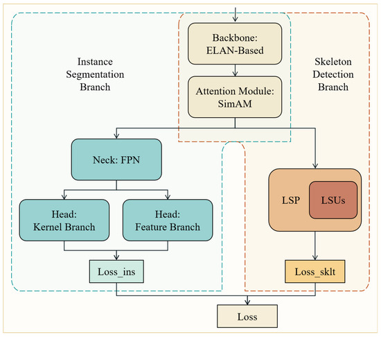 Backbone. According to previous research, the best backbone for SOLOv2 is RseNet, and Inception-v3 is the best for AdaLSN. To further compare the impact of the backbone, this paper trains SOLOv2 (only for the instance-segmentation branch), AdaLSN with a fixed architecture (only for the skeleton-detection branch), and our dynamic-weight parallel instance and skeleton network with different backbones, including ELAN-based backbone, Inception-v3, ResNet-50 and ResNet-101.