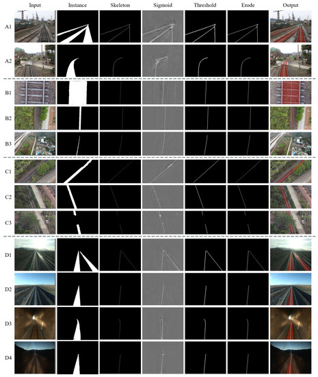 Figure 6(B1–B3), the model can always accurately identify the railways and skeletons when the flying height changes from low to high. In certain environments, the railway may be shaded by trees or other objects, which increases the difficulty of the task. As shown in