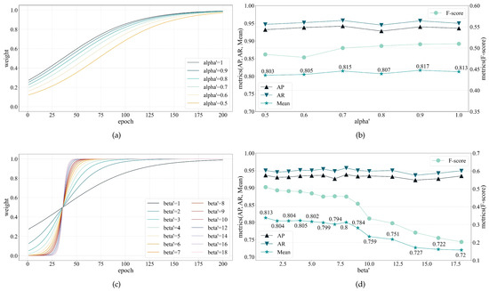 Loss function parameter. This paper designs a novel fused loss function to adjust the dynamic weight of the two branches during training. To increase the weight of the skeleton-detection branch as the loss of the instance-segmentation branch gradually stabilizes, the sigmoid function is chosen as the base. The sum of the weights for the two branches is always kept at one. This paper adds two parameters to adjust the function: alpha, which determines when the weight is 0.5, and beta, which determines the rate of weight increases.