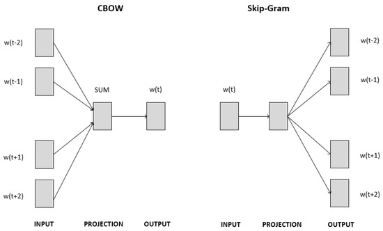 The Word2vec method has two different learning models. These are CBOW (continuous bag-of-words model) and skip-gram (continuous skip-gram model) [44]. The architectures of these models are illustrated in Figure 2.