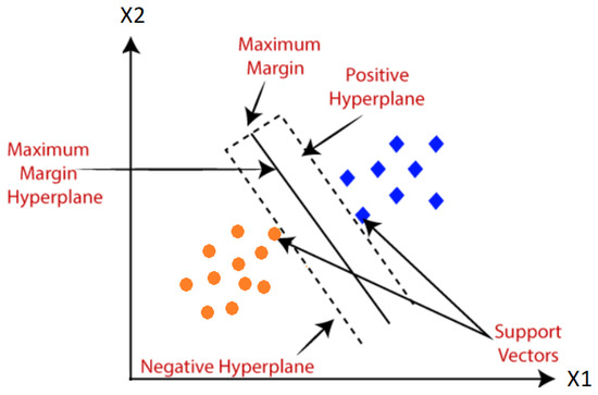 SVM is used to classify data on the basis of two distinct categories and to find the best hyperplane [51]. The primary objective is to find a hyperplane that maximizes the distance with the nearest data points [52,53]. To maximize the minimum distance between the hyperplane and the training data, an algorithmically selected hyperplane is used. The minimum distance is usually referred to as the margin [54]. The structure of the SVM is shown in Figure 5.