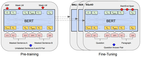 BERT can be applied in two phases: pretraining and fine-tuning. During pretraining, the model learns to recognize the input text data and its contextual relationships. In the fine-tuning phase, the model adapts to a specific task and refines its understanding to provide the best solution. By adding a new layer, a pretrained BERT model can be fine-tuned to achieve exemplary results [61]. BERT uses the same architecture in the pretraining and fine-tuning stages, and both stages are shown in Figure 7.