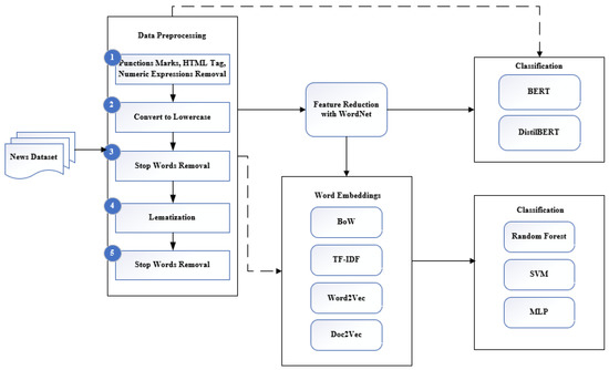 In Table 11, the precision, recall, F1-score and accuracy values of the experimental studies using BERT and DistilBERT are presented. In the experiments conducted using models from the deep learning category, the highest success was achieved with the hybrid use of WordNet and BERT, where an accuracy of 93.77% was obtained. This value represents the highest accuracy result obtained in this study. In order to achieve the highest value possible, fine-tuning was performed, and the parameters in Table 10 were used. In the experiment, batch size was fixed as 4 for both the training and validation set. Additionally, among the epoch values of 1, 3, 5, 7 and 10 used, the highest success values were obtained when using three and five epochs, and it was observed that the success decreased when seven epochs were used. Because it is a powerful model, BERT achieved the highest success rate [55]. BERT uses masked language models to enable deep bidirectional representations to be pretrained. The masked language model randomly masks some tokens from the input, predicting the original of the masked word based only on its context. BERT is very strong for developing an understanding of context-heavy texts. The dataset we used consisted of English long-form news content. Therefore, it was important to analyze it from a semantic and contextual point of view. By using BERT and WordNet together to do this, deeper learning was attained and high success was achieved.