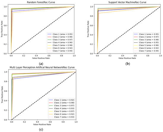 Figure 10 presents the ROC curves obtained when using BERT and WordNet together and when using DistilBERT and WordNet together. The area values of each class label are shown separately in the ROC curves. In BERT, which is a deep learning-based classifier, the highest accuracy value was obtained with the hybrid use of WordNet and BERT. It can be seen from Figure 10a, which shows this method, that the class label field values are closer to each other than in Figure 10b.