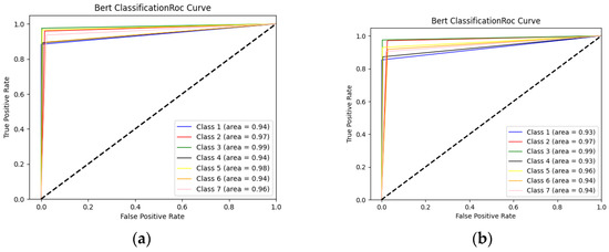 ROC curves formed when using BERT alone and when using WordNet and BERT together. (a) BERT+WordNet ROC Curve; (b) DistilBERT+WordNet ROC Curve.