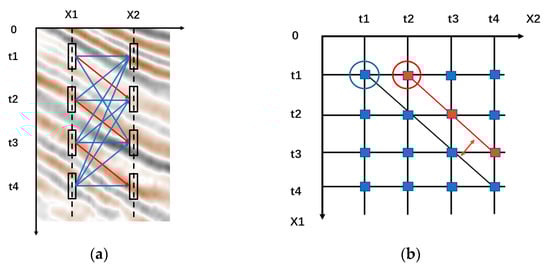 After sampling the original seismic data, a regularized sample space is obtained. In the sample space, the two neighboring seismic traces, X1 and X2, are selected, and the correlation between each point in X1 and each point in X2 is calculated. The arrows in Figure 1a represent the different connections, and the different matching relationships can be seen in Figure 1b. The blue squares inside the blue circles in Figure 1b represent the correlation value between the seed point of X1 at t1 and the seed point of X2 at t1, and the red squares inside the red circles represent the correlation value between the seed point of X1 at t1 and the seed point of X2 at t2. There are two lines in Figure 1b representing the different matching paths between the seed points contained in X1 and X2.