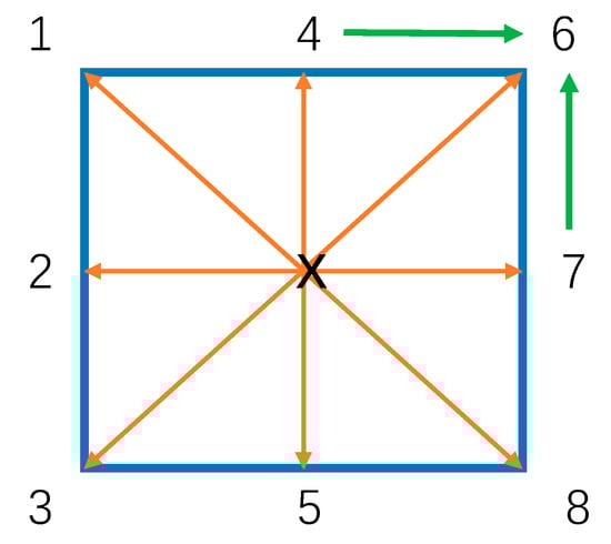 Set the central road as X, and transfer the label of X road to [1, 2, 3, 4, 5, 6, 7, 8] for a total of 8 data roads via the DTW algorithm. If there is a mapping horizon position between two adjacent roads, it means that each horizon position point on the surrounding 8 data roads can calculate 3 correlation coefficient values with the surrounding 3 roads. For example, a seed point marked as θ on the 6th road can calculate the correlation coefficient with the seismic roads 4, 7, and X.
