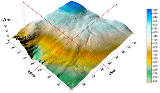 Figure 20, Figure 21 and Figure 22 are the results of automatic horizon tracking for the Qinnan 3D seismic data, Figure 20 is a 2D display of the inline cross-section, Figure 21 is a 2D display of the xline cross-section, and Figure 22 is a 3D display of the Q1 horizon (the red horizon line in the cross-section). As can be seen from the tracking results, the method in this paper can automatically terminate the horizon at the overlapped and sharp-extinct areas, effectively restoring the horizon structure, and is helpful for identifying rock horizon traps. When the fault spacing is small, the method can achieve good automatic tracking over faults.