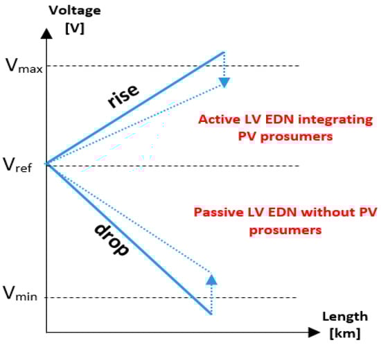 The reduction in centralized power plants’ energy production has been attributed to the emergence of distributed generation in electric distribution networks (EDNs), particularly at the low voltage (LV) level []. The increasing number of photovoltaic systems (PV) installed at the level of consumers (called prosumers) connected to low voltage electric distribution networks (LVEDNs) is expected to increase annually due to their various economic and technical advantages, besides the fact that they also can help reduce greenhouse gas emissions. However, distribution network operators (DNOs) are not fully prepared to integrate a very high number of PV prosumers with a variable character due to, on the one hand, the topologies of LVEDNs and, on the other hand, the ageing technical infrastructure [].