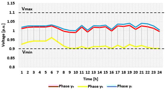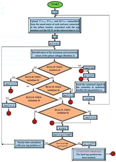If the extreme values Vmins,α(s−1), Vmaxs,α(s−1) exceed the allowable limits (Vmina and Vmaxa), then the tap position is modified with a step Δαs(k) in each iteration k of the time slot s based on the following rules [,]: