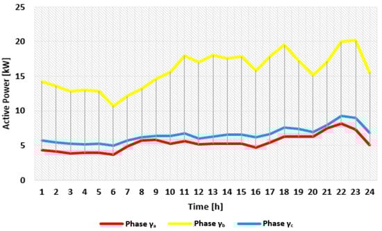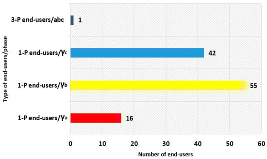 The LVEDN is an aerial network with four conductors (three phases and a neutral), having detailed features in Table 1. In total, 114 end-users are connected at the three phases, and their distribution is presented in Figure 5.