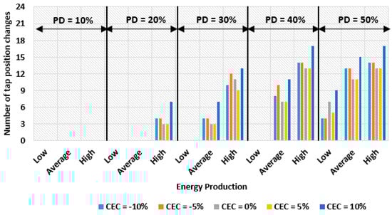 Thus, the high intermittency of these sources could be a burden for DNOs in the voltage control of LVEDNs. As long as new strategies are not developed, the voltage violations could appear more and more often when a high number of PV prosumers are integrated, in conditions in which the voltage control band is usually between 0.9 and 1.1 p.u. of the rated voltage. Developing new strategies will require more advanced voltage control technologies, including smart devices/equipment that can process the data and help to identify the optimal solution []. The advanced voltage control technologies, integrated especially in the pilot LVEDNs, are represented by automatic voltage regulators [,], energy storage systems [,], capacitor banks [,], or load balancing devices [,]. However, before they can be implemented widely and correlated with each other, DNOs should do a cost–benefit analysis. One of the most efficient devices to ensure the resilience of voltage control is represented by the on-load tap changer fitted to the MV/LV distribution transformers [,,,,]. These devices have demonstrated their performance in high (HV) and ultra-high (UHV) voltage electric transmission networks. The research carried out so far has not clearly defined the maximum PV hosting capacity of LVEDNs supplied from an EDS with an OLTC-fitted transformer. In these conditions, efficient strategies must be developed to increase as much as possible the limit threshold.