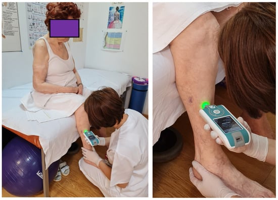 The chosen positions allowed patients to be fully relaxed. The measurements were performed at the level of the muscle belly; the device was always perpendicular to the skin surface. First determination was done on the major pectoralis muscle. The test was done with the patient relaxed, in a sitting position; the same position was kept for the upper limb test at the level of the biceps brachialis muscle (Figure 2). The next two measurements included the inferior limb. The test at the thigh level was done in the posterior area at the level of the femoral biceps muscle; the test at this level was done with the patient in a prone position because the device should be perpendicular to the surface of the skin. For the last determination, the patient was in the sitting position; the anterior tibialis muscle was tested (Figure 3). The same muscles were tested in the healthy controls. All muscles were measured in the same order for all participants (both groups).