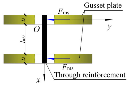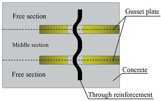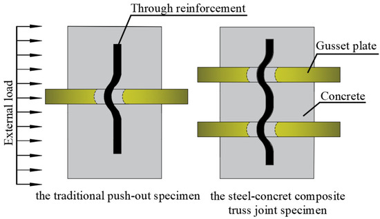 Although the deformation of the PBL shear key in the joint is similar to that of the PBL shear key in the push-out test, as shown in Figure 2, the boundary support conditions of the joint specimen are different from those of the push-out specimen. The penetrating steel bar of the joint specimen passes through two steel plates, and this results in a state of dual-end constraint for the steel bar between the two plates; moreover, the steel bar on the outside of the two plates experiences fixation at one end and is free on the other end. Additionally, the mechanical performance of the shear key section between the two nodal plates and the shear section at both ends of the joint is different. However, there is no intermediate section with both ends restrained in the push-out specimen. Based on the above considerations, the calculation formula of the push-out test is unsuitable for direct applications relative to the nodal plate.