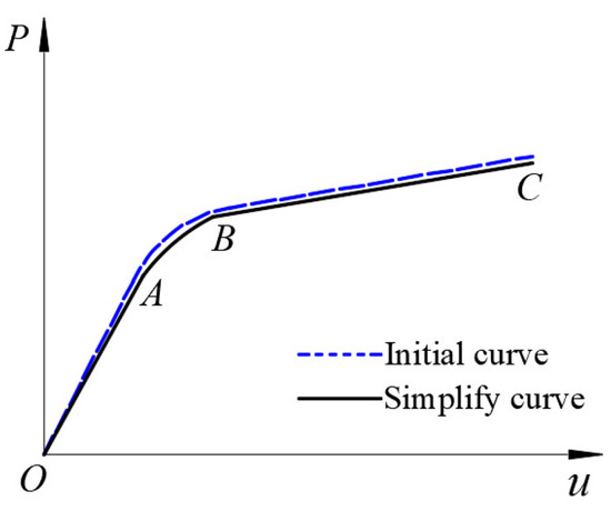 Among them, t denotes the thickness of the joint plate; denotes the standard value of the shear strength of tenon concrete; denotes the standard value of tensile strength of the penetrating steel bar; D and d denote the diameter of the opening and the diameter of penetrating steel bar, respectively. The end point of the elastic section is regarded as the starting point of the plastic section, and the c value can be determined according to reference point (, ); thus, the load–displacement curve formula of the plastic section can be obtained.