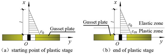 As shown in Figure 7b, for the plastic endpoint of the PBL shear key in the free section, the concrete at the position of reaches the ultimate compressive strain. Due to the coordination of the deformation within the PBL shear key, the deflection of the steel bar through the opening position is equal to the deformation of the concrete; thus, we have the following.