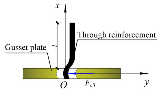 In the formula, denotes the steel joint plate’s tensile strength design value (N/mm2); denotes the steel shear strength design value (N/mm2). The shear force acting on the penetrating steel bar at this time (kN) is as follows: