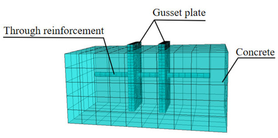 An ABAQUS finite element model was established based on the PBL shear key design parameters from reference [19], as shown in Figure 9. Concrete was simulated using solid elements with a plastic damage model composed of relationships. The steel plates and penetrating steel bars were also simulated using solid elements, and a bi-linear constitutive model was used for both. The connection relationship between each component is set as follows: The penetrating steel bars and steel plates were embedded in concrete, and the circular holes in the steel plate and the penetrating steel bars were bound by constraints. The comparison between the finite element results and the calculated results is shown in Figure 10, and it is easy to see that the calculated results agree well with experimental values.