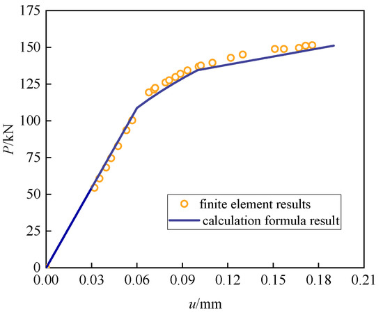 The design parameters of PBL shear keys in reference [9] are selected to verify the formula. The experimental values of specimens SB60-22-1 and SB45-12-3 in reference [9] are compared with the calculated results in Figure 11a,b, and their correlation is shown in Table 1. It can be observed that the results of the formula are in good agreement with the results of the finite element calculation and test. In Figure 10, the experimental values in the elastic stage are slightly higher than the calculated results due to the assumption that the bond between steel and concrete is not considered in the calculation formula. In the actual experiment, the bond effect exists, which results in improved load-carrying capacity in the elastic stage compared to the calculated values. However, the error is small and within an acceptable range.