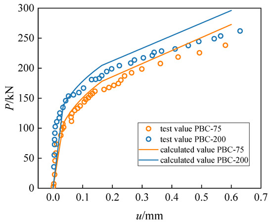 The design parameters of the PBL shear key in reference [20] are selected to verify the formula. With the exception of different spacings between the two joints, the other parameters of the two specimens—PBC-75 and 200—are the same, and the relevant parameters are included in the formula. The comparison between the test values and the calculated results is shown in Figure 12, and the correlation is shown in Table 1. It can be observed that the test values of PBC-75 and PBC-200 are in good agreement with the calculation results of the formula. The experimental values in the strengthening stage are slightly lower than the calculated values because the calculation formula only considered the main horizontal force for convenience, while the actual failure process is subject to more complex forces, but the error is not significant. According to the results of the formula, it can be observed that the slope of the curve of the two specimens in the elastic section is slightly different, which increases slightly with the increase in plate spacing, but it does not change much; moreover, the load–slip curve after the elastic section has no obvious differences. The difference between the two specimens lies in a single variable, that is, the lengths of the free section of the steel bar, which are 190 mm and 130 mm. This shows that, within a reasonable range, the length distribution of the penetrating steel bar between the two joints is more uniform, which will improve the initial stiffness of the PBL key. The diameter of the penetrating steel bar is 20 mm, and the aspect ratios of the two specimens are all greater than 6. Because the two types of aspect ratios are all within the range of the semi-infinite pile’s length, the influence is not significant.