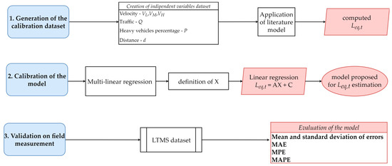 Generally speaking, the main types of models are statistic, analytic, microscopic, macroscopic, semi-dynamic, and dynamic [13]. Focusing on time dependence, the models are usually built to predict noise indices over a certain period of time dependent on selected independent variables [14]. Variables chosen can vary in type and number, but the most used are certainly traffic volume, the percentage of heavy vehicles, and the distance between the source and receiver. Additional parameters considered can be the road slope, the texture of the asphalt, the average speed of the flow, and the weather conditions. These kinds of models are flexible and easy to use, including for non-expert users. They are basically functions in which selected “independent” parameters are related to the noise level through proper coefficients. Their efficiency strongly depends on the calibration step, that is, the process that establishes and details the correlation between each parameter and the noise level. When this process is run through regression using in-field-measured data, the model belongs to the statistical category.