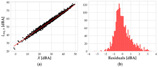 (a) Linear regression for Leq,h computed values and the X variable; (b) distribution of residuals.