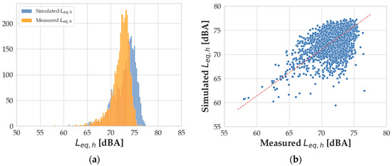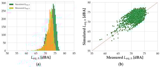 (a) Distribution of the simulated (blue) and the measured (orange) Leq,h values; (b) scatterplot of the computed vs. measured Leq,h values.