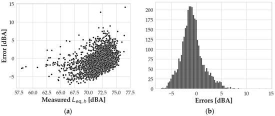 A statistical analysis of the distribution indicates a certain similarity between the distributions, highlighting a slight overestimation of the model. The mean values of the distributions differ for an absolute value of 0.82 dBA and their skewness differs for an absolute value of 0.48. The kurtosis indexes are 4.87 and 2.06 for the measured and computed Leq,h values, respectively. Error analysis was also performed on the specific application of the model, resulting in Figure 4a, where errors are calculated as the measured Leq,h minus the simulated Leq,h.